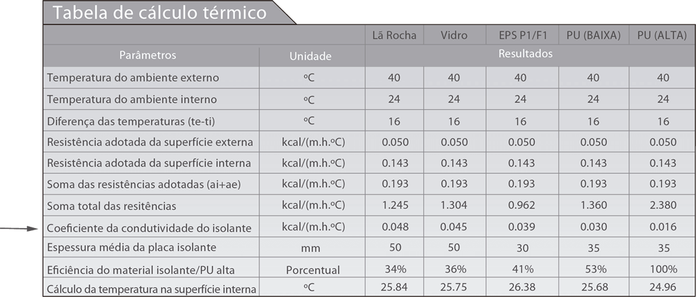* Quanto menor o coeficiente da condutividade do isolante maior será o nível de isolamento (inversamente proporcionais), portanto o Poliuretano de Alta Densidade é o que mais prove reduções de calorias.